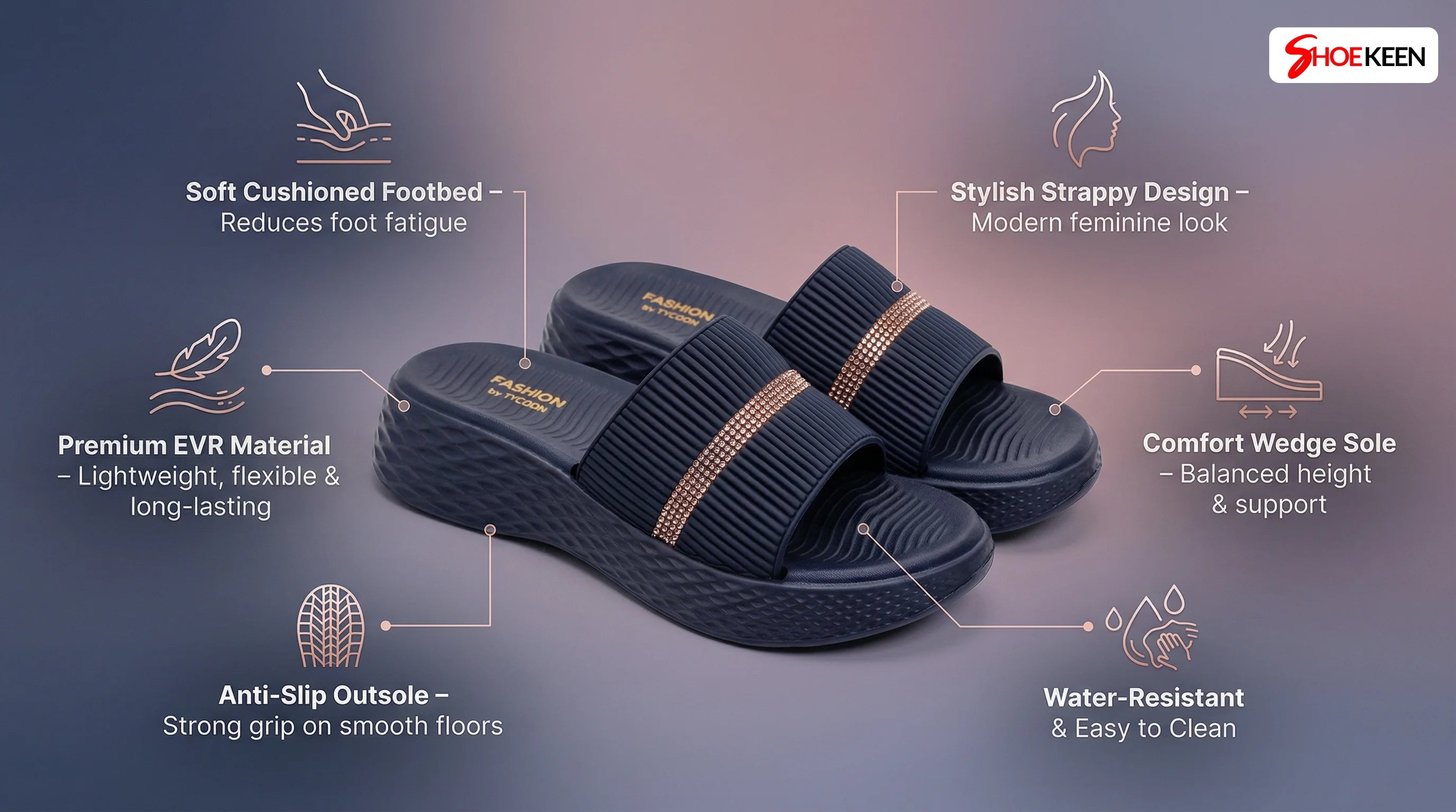 Upgrade your daily comfort with the women flip-on flip flops, designed specially for women who want both elegance and cushioning in every step. Made from high-quality EVR (Ethylene Vinyl Rubber) material, this slipper delivers lightweight flexibility, durability, and superior comfort for all-day wear.