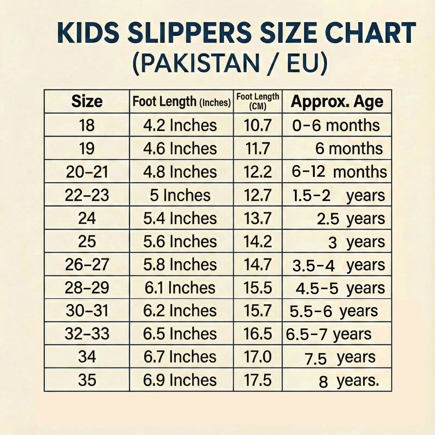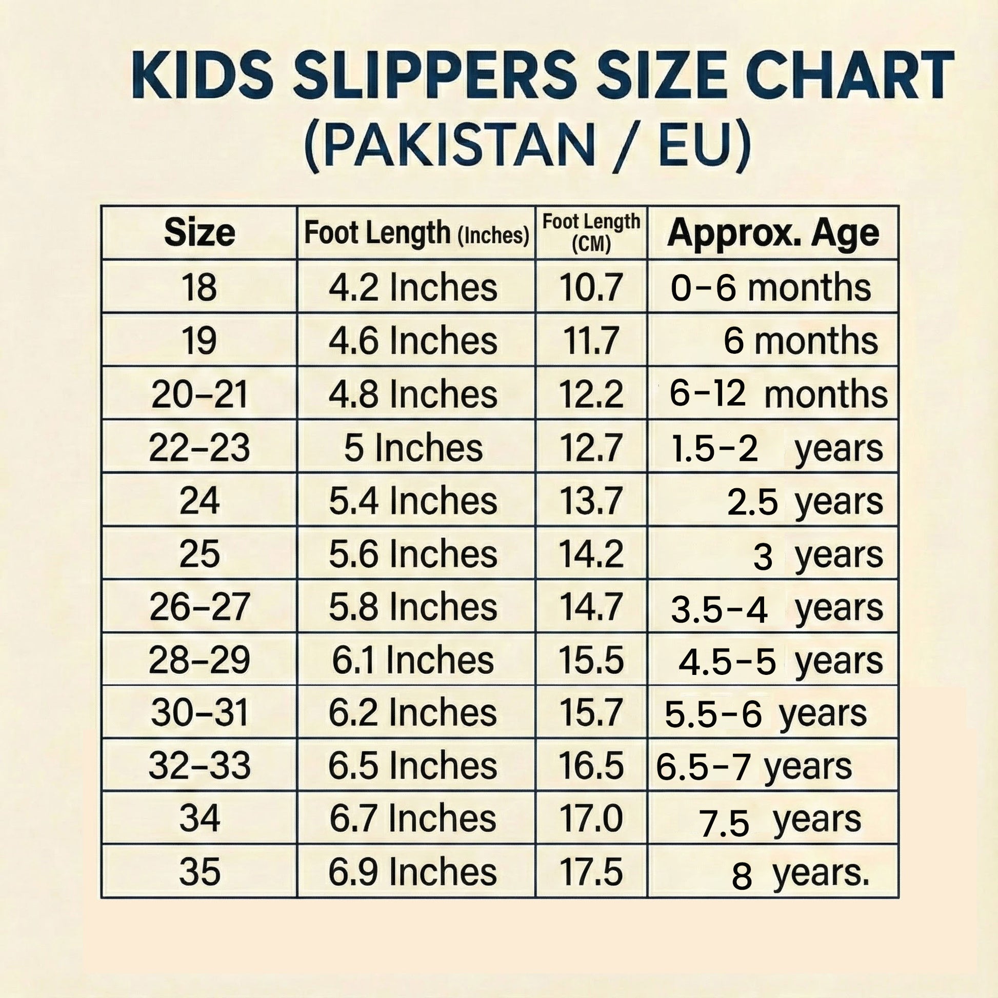 نوٹ: چارٹ میں دیے گئے سائز چپل کے اندرونی پیمائش کے مطابق ہیں، باہر سے ناپے گئے سائز نہیں ہیں۔